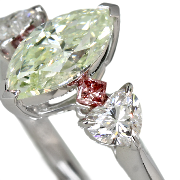 サイドにセットされたビビッドクラスのピンクダイヤモンドが、よりグリーンイエローの彩度を引き出し、色鮮やかに…。