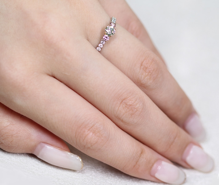 サイドのピンクダイヤモンドも、一目でピンクとわかるFANCY PINKの彩り。