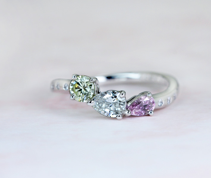 ピンクダイヤモンドは、周りにカラーレスダイヤモンドをセットすることでより一層