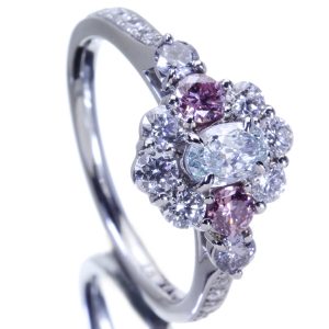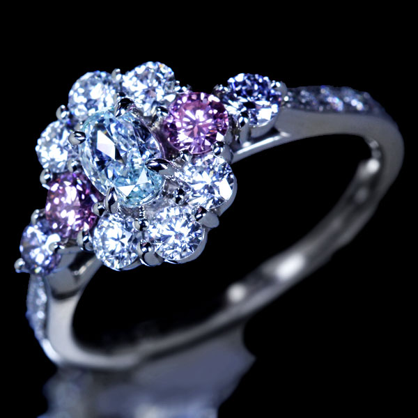 ブルーダイヤモンドのサイドには、ヴィヴィッドに感じられるピンクと、ヴァイオレットのナチュラルカラーを配しています。