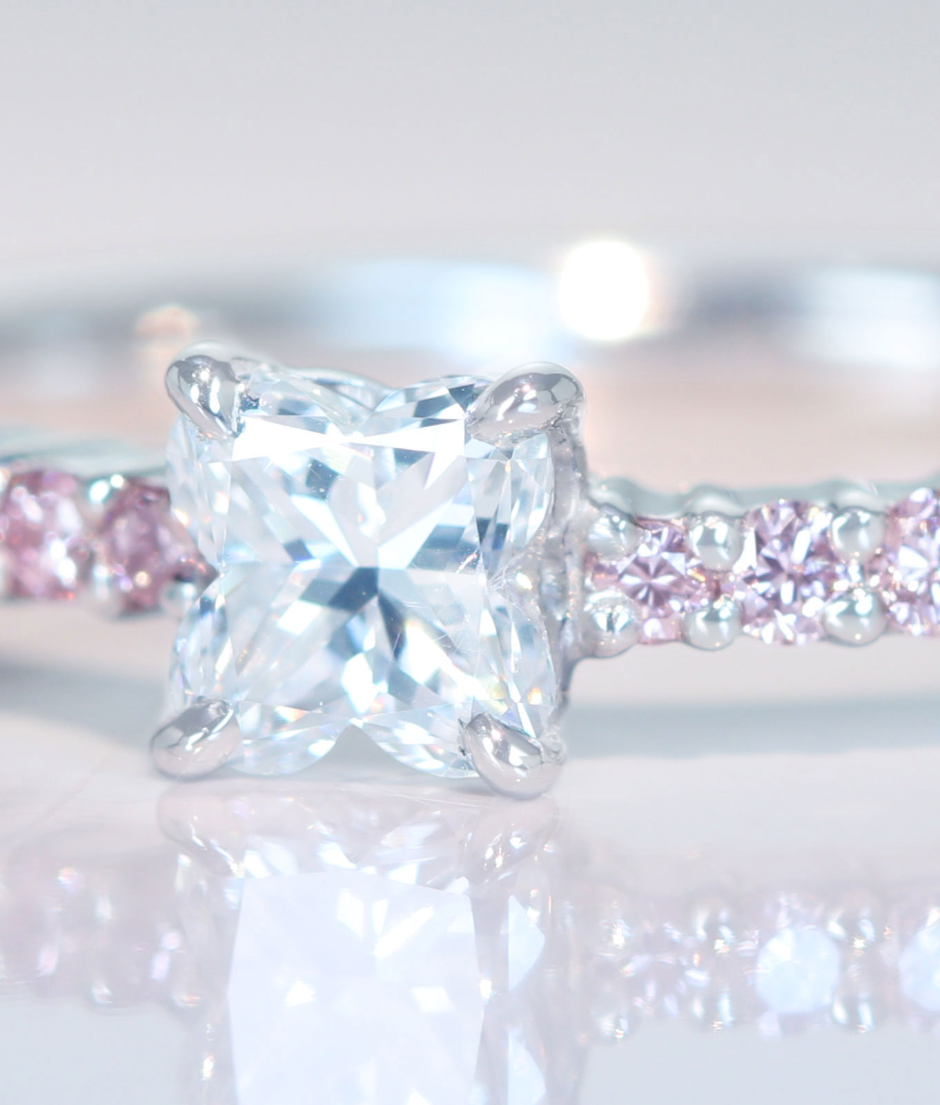鍛造(たんぞう)の手仕事は繊細であり、天然のピンクメレダイヤのセットはジュエルプラネットでしか叶わない宝石に仕上がっています。
