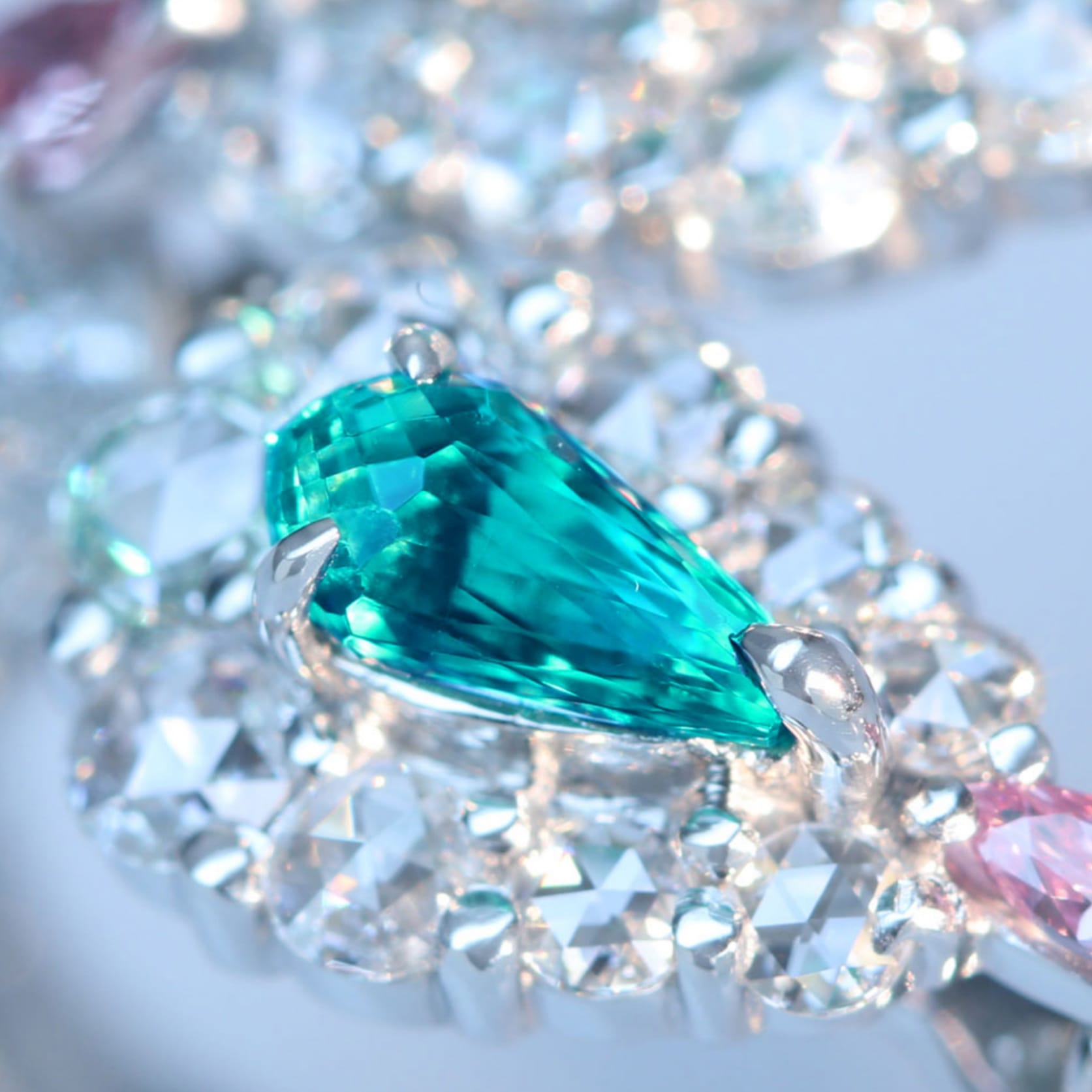 その上できらめきが非常にきめ細やかな繊細かつ大胆な美しさを放つブリオレットカットという貴重な品質を使用しています。