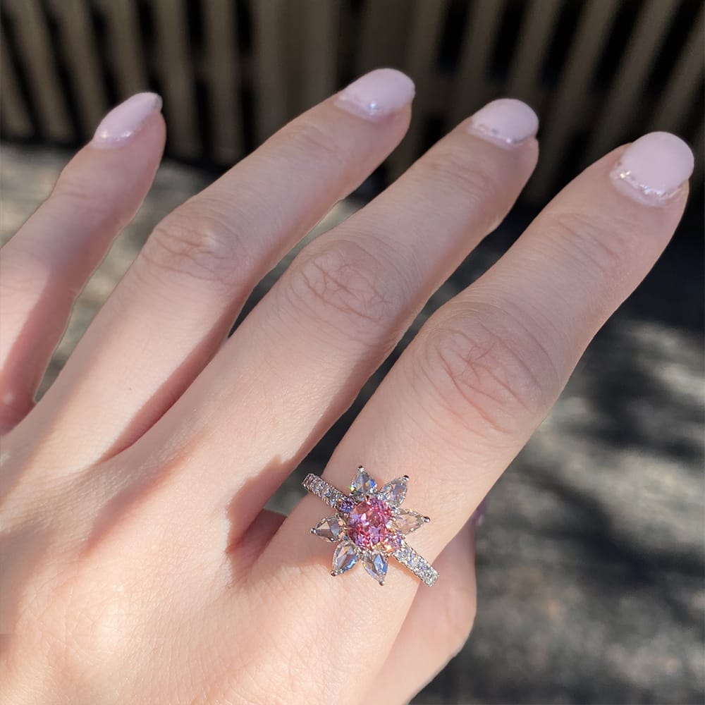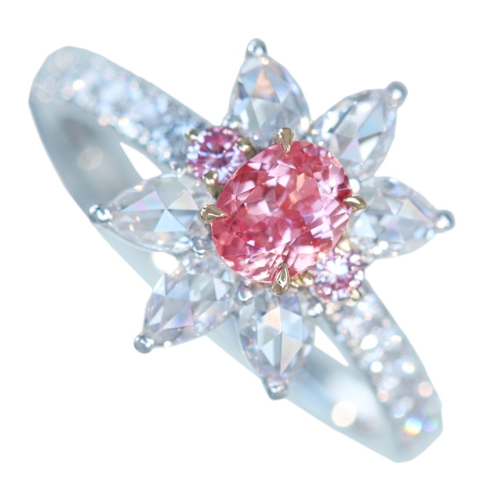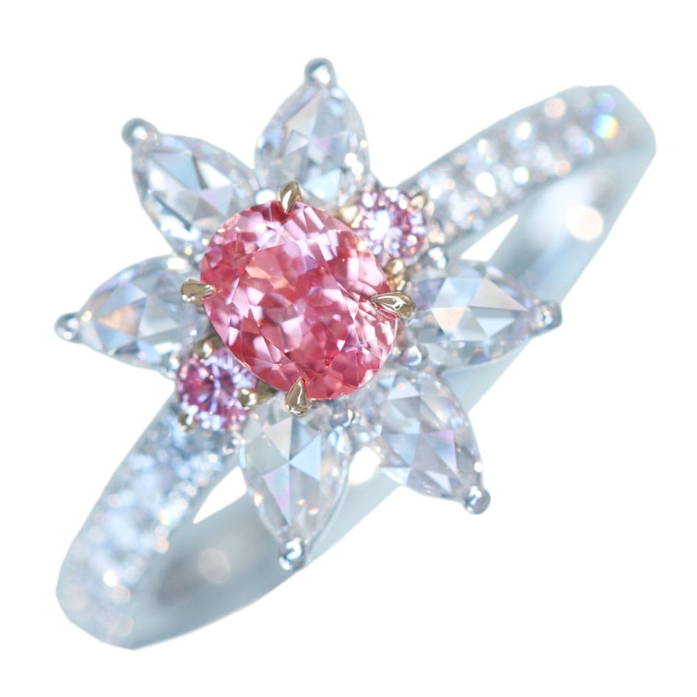 パパラチャサファイアのサイドに添えたのはしっとりと色を帯びたピンクダイヤモンド。