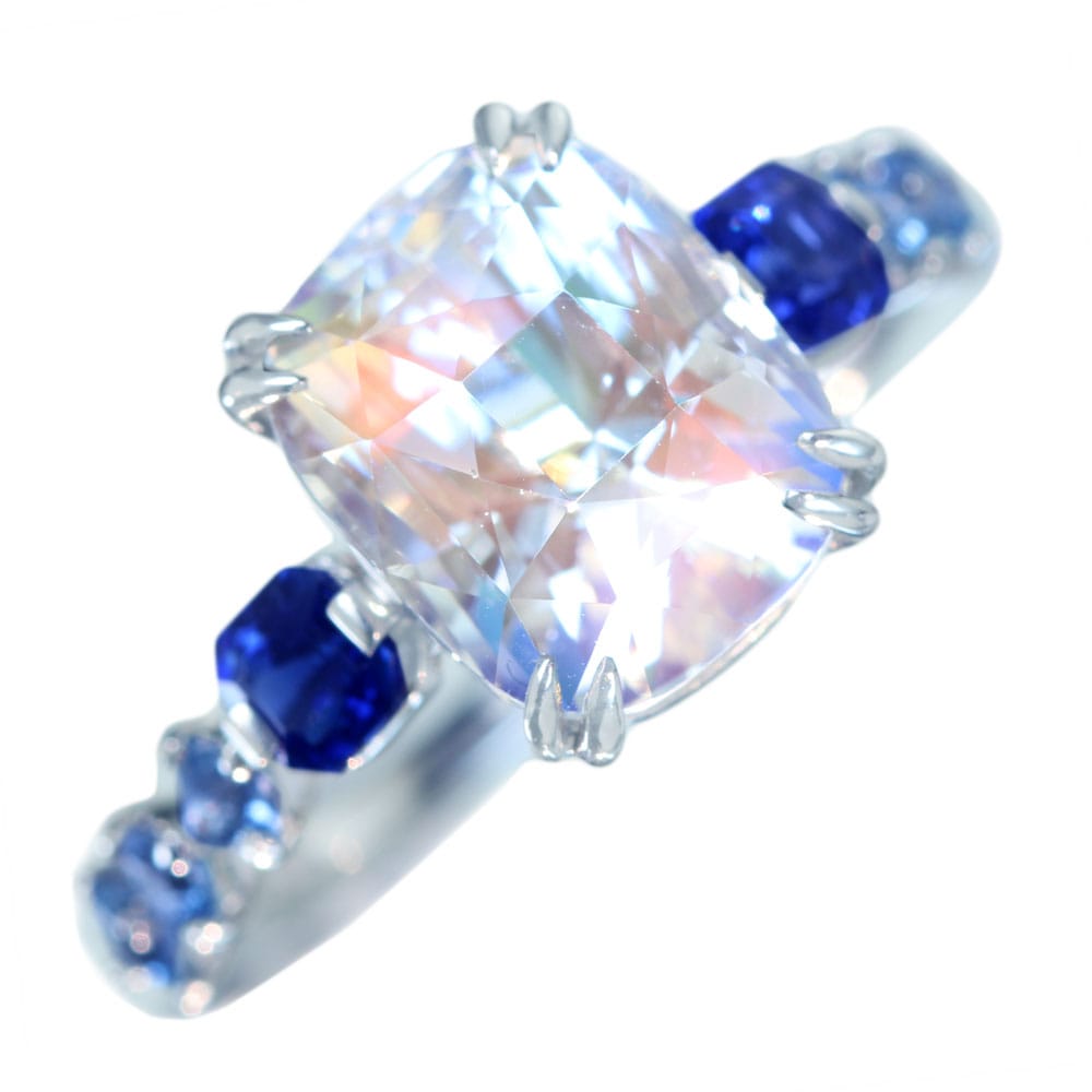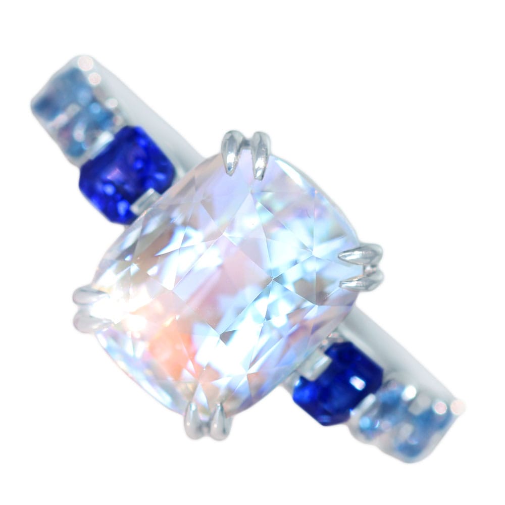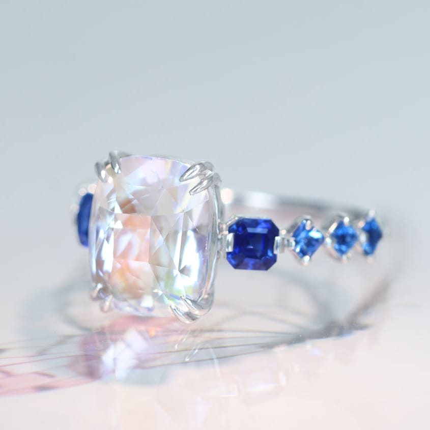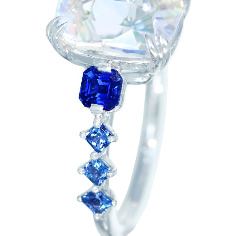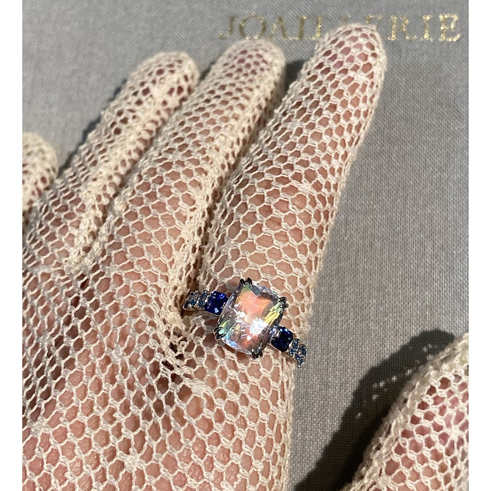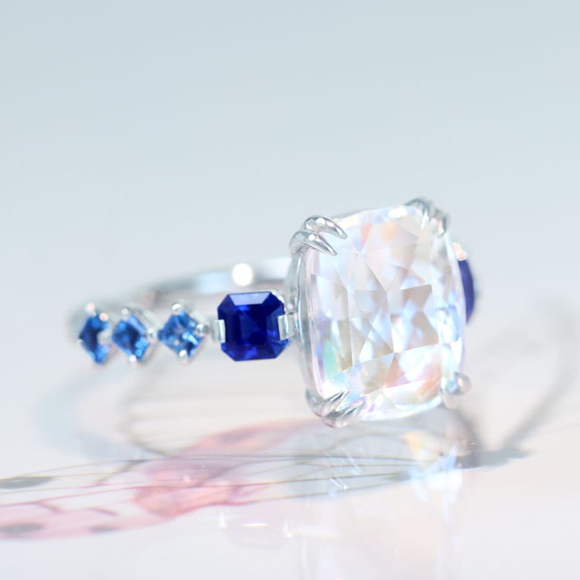 リング中央のムーンストーンから溢れる幻想的な光を受け取った青のグラデーションの美しさ。