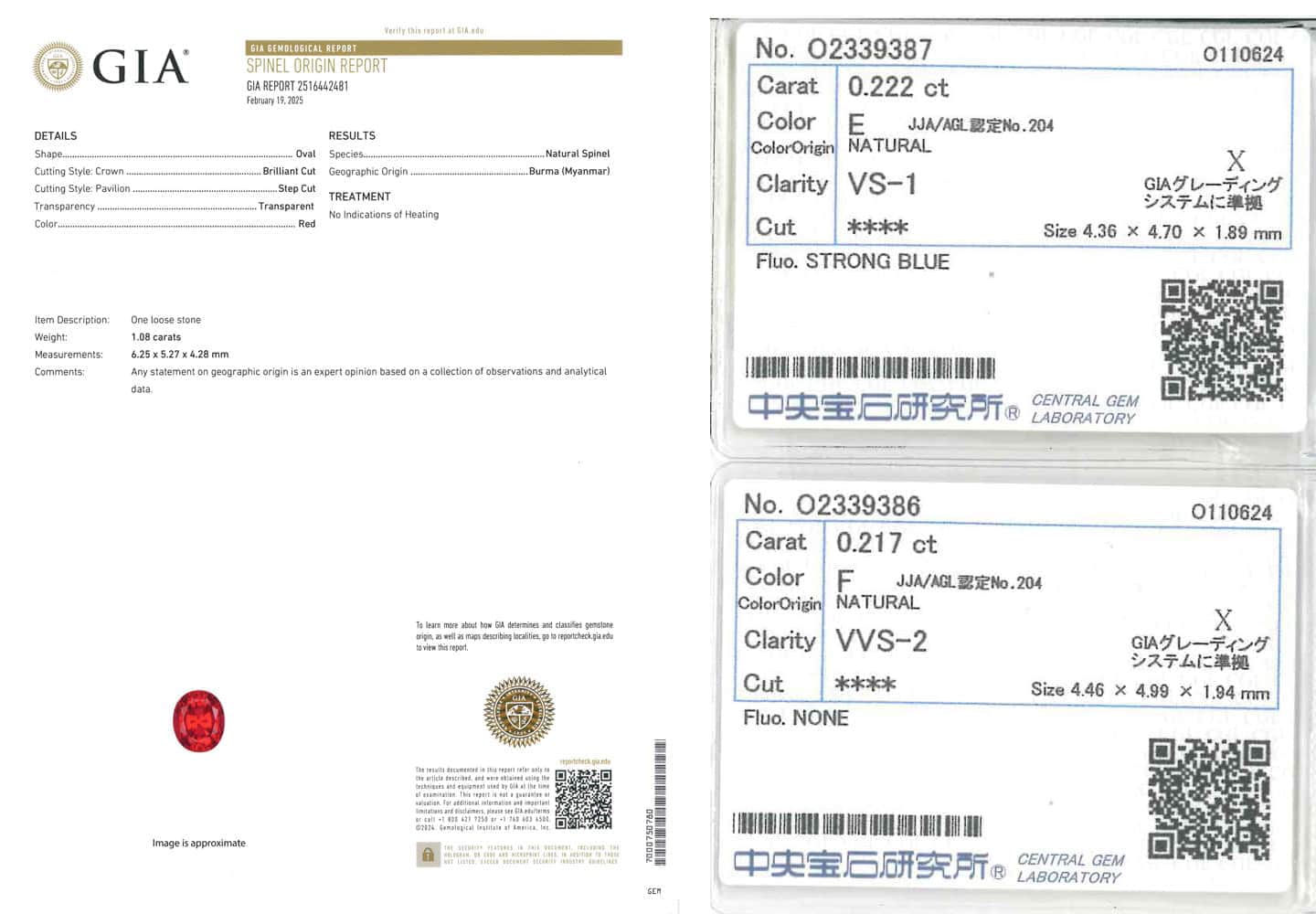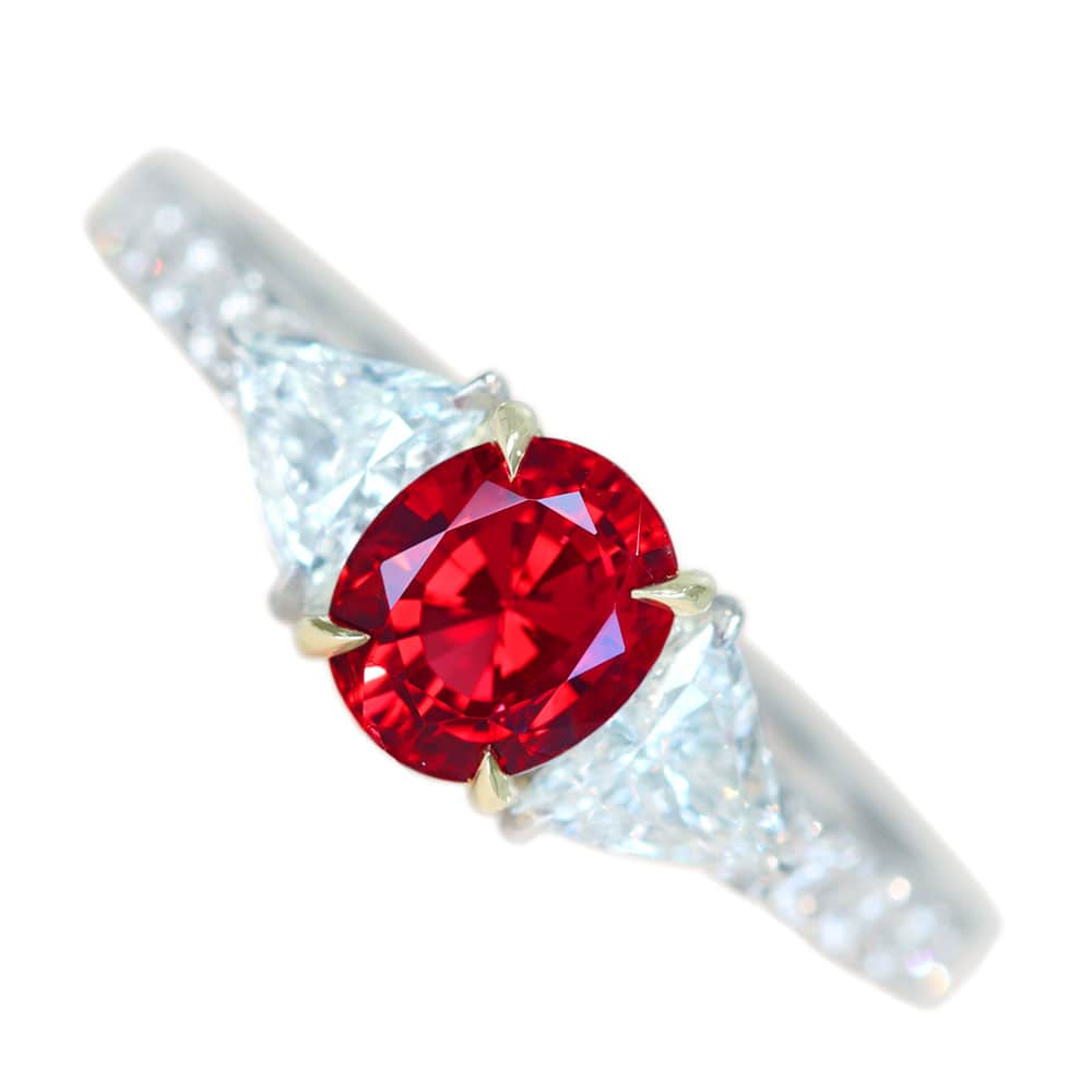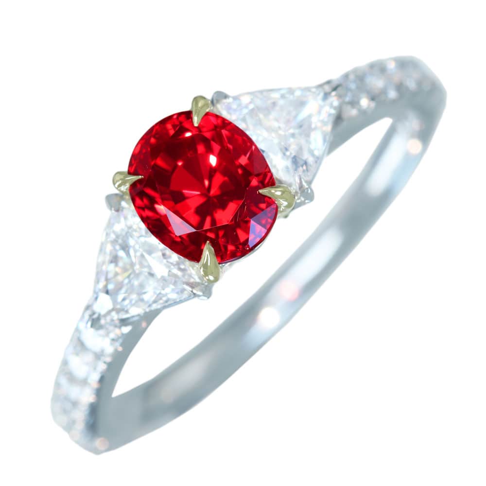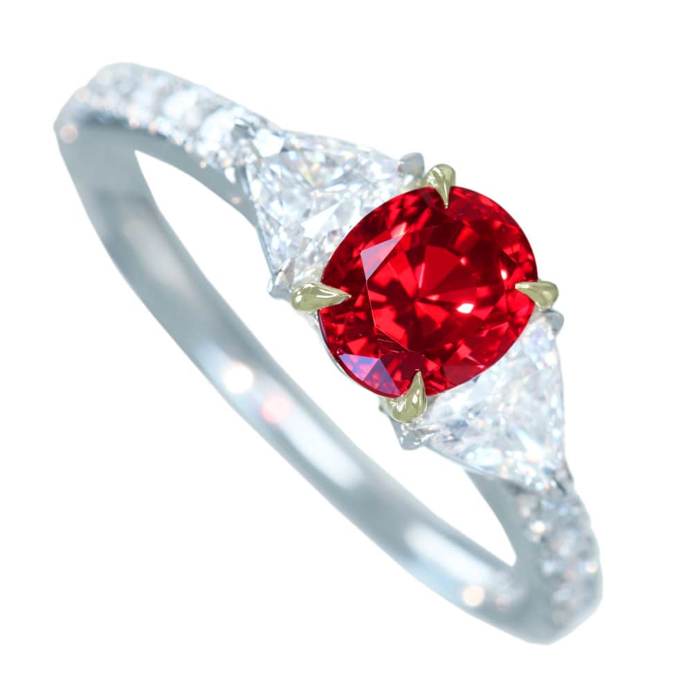 【HANDMADE】PT950/K18 ビルマ産 非加熱 レッドスピネル 1.08ct 0.222ct E VS2/0.217 F VVS2 トリリアントカット ダイヤモンド 0.262ct リング[GIA][中央宝石研究所]