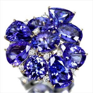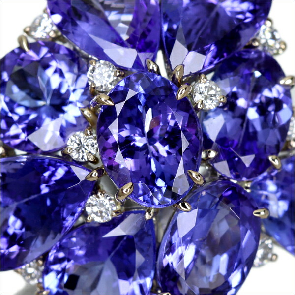 形・サイズの異なるタンザナイトを立体的にセットし、お手元にふっくらと輝きがひろがる見事な完成度。