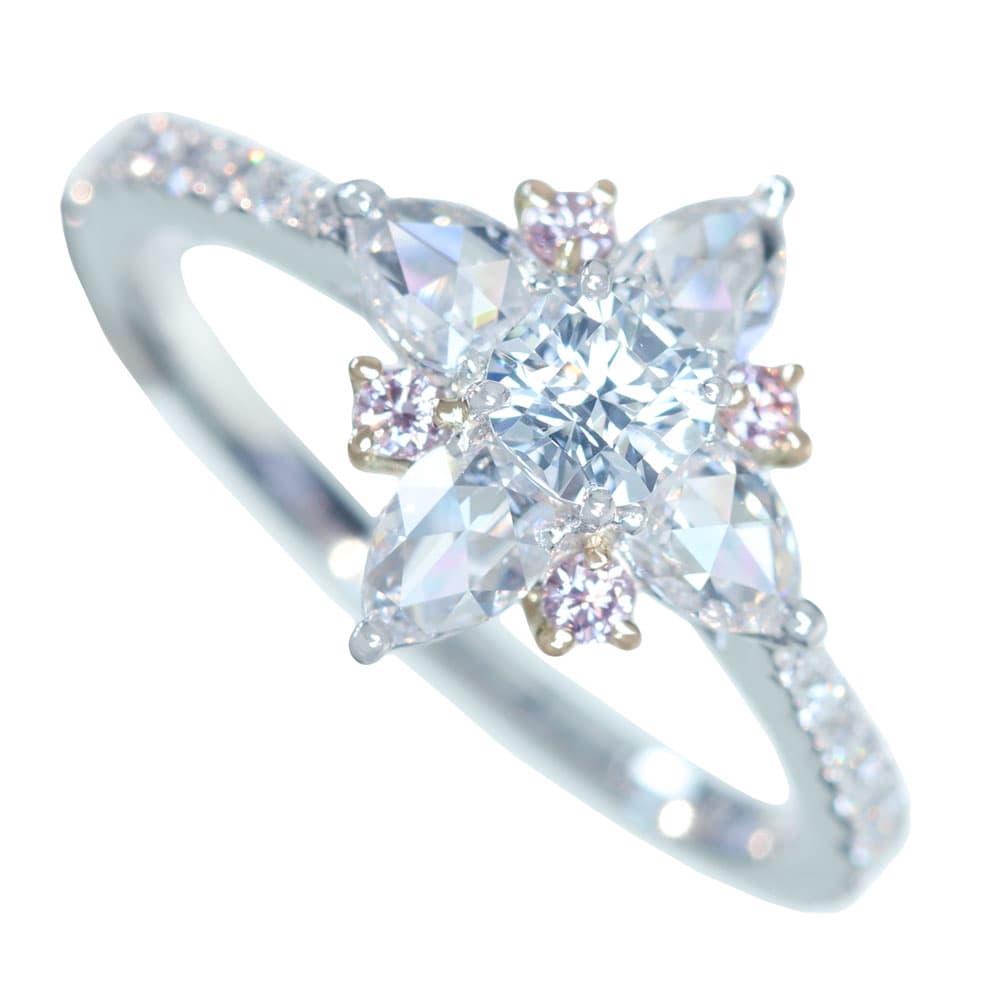 ローズカットダイヤモンドで描く贅沢な花びらは指に嵌めてもその透明感は馴染むようでもありつつ、時空が異なるように、潤んで雫のような様子を見せます。