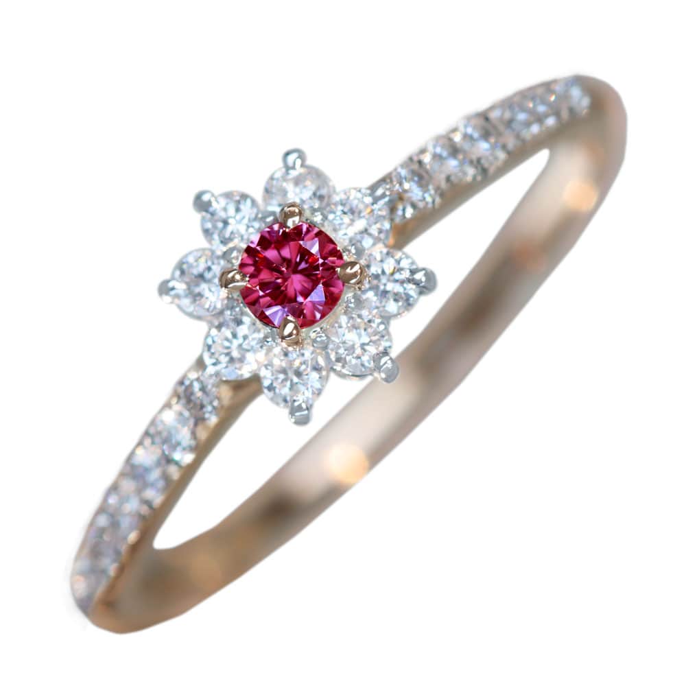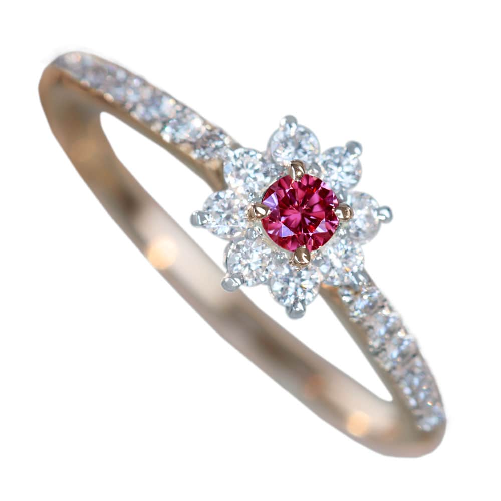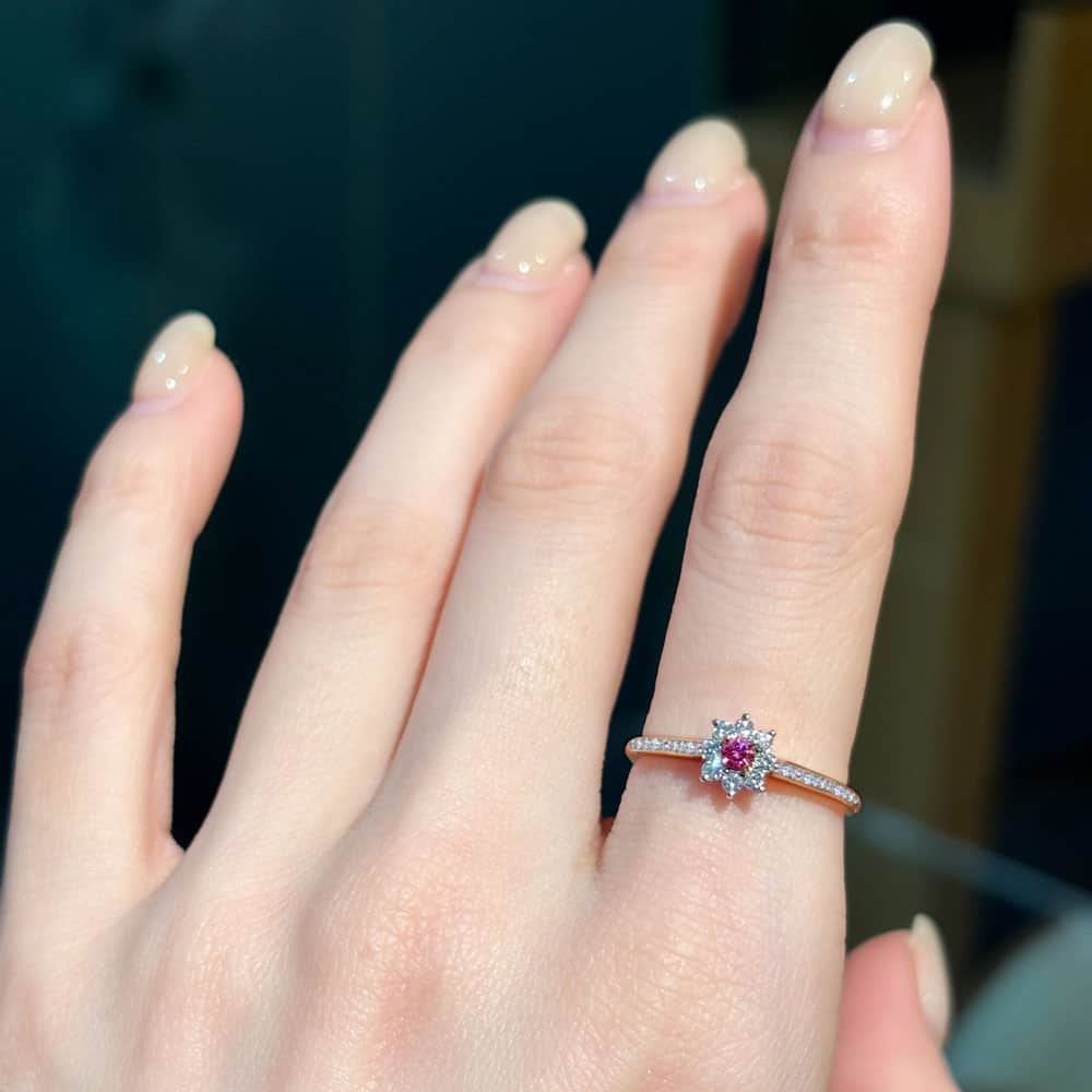 花びらのように取り巻くダイヤモンドがその色彩をくっきりと引き立てフラワーの造形が華やぎを添えています。