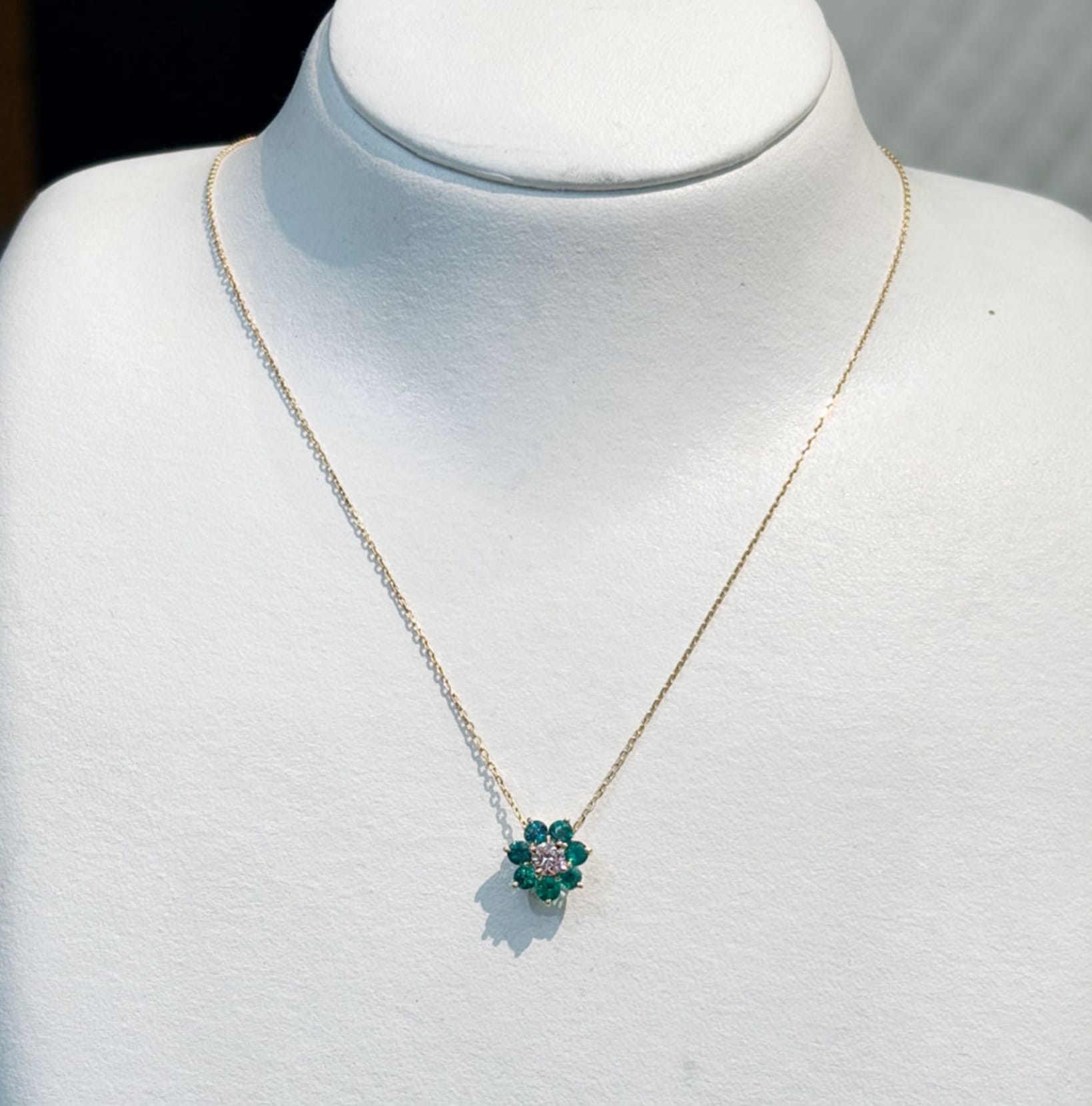 【HANDMADE】PT950/K18PG 天然ピンクダイヤモンド 0.217ct コロンビア産エメラルド 0.577ct ペンダントトップ フラワーモチーフ[中央宝石研究所]
