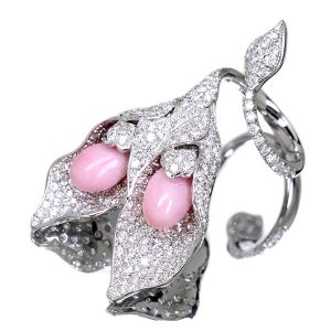 手元に、コンクパールのリーフがぴったりと寄り添う形にもお召いただくことが出来、二通りの方法でお楽しみいただくことが可能なジュエリーです。