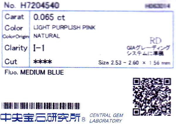 0.065ct LIGHT PURPLISH PINK I1 ピンクダイヤモンドルース※中央宝石研究所ソーティングシート付