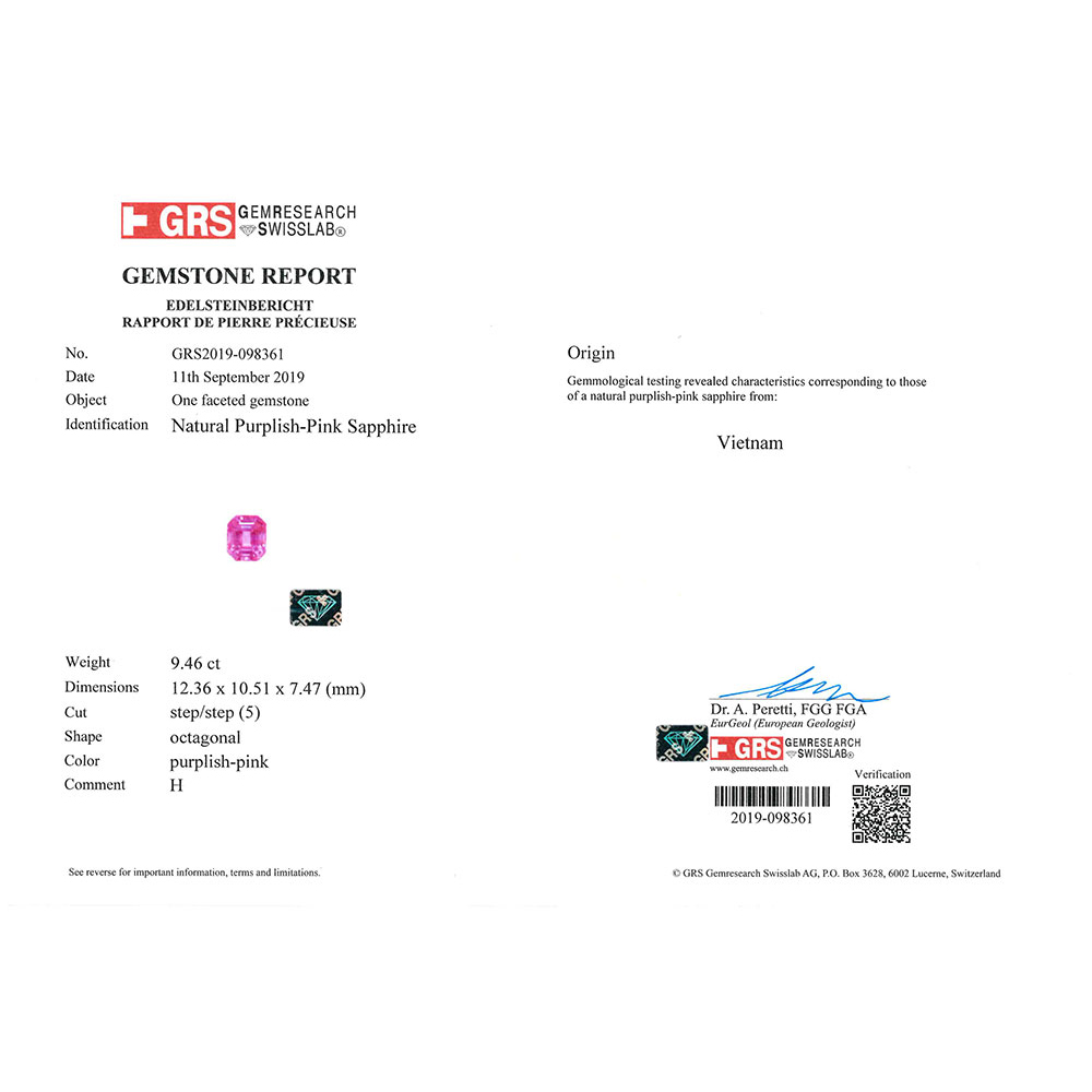 PT900 ヴェトナム産ピンクサファイア 9.46ct リング ダイヤモンド 1.92ct〔GRS〕エメラルドカット